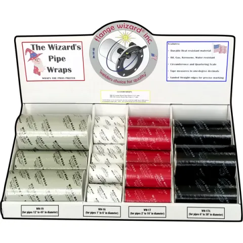 Flange Wizard's distributors now can have all four of the most popular size wraps in a neat counter display. The new Pipe Wrap Display will arrive completely assembled with product ready for your customers to purchase.