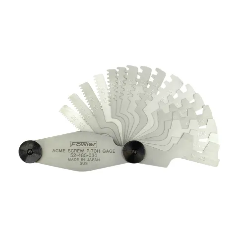 Acme Screw Pitch Gages (29° angle) made of fine stainless steel. Each blade is 3-1⁄2"/90mm long and .03"/.8mm thick 16 blades (1, 1-1/3, 1-1/2, 1-3/4, 2, 2-1/2, 3, 3-1/2, 4, 5, 6, 7, 8, 9, 10 &12 pitch); 29° angle
