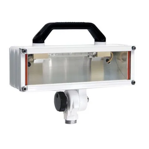 The lamphead has one (1) quartz halogen bulb. The bulb is accessible through the front. The lamphead directs 50 percent of the light onto the action area while providing 50 percent to illuminate the working area. The lamphead angle of elevation is adjustable at a pivot in the mounting arm and the position locked with a round knurled locking knob. The lamphead incorporates heat-dissipating fins and be no more than 5-1/4" deep by 3-3/8" high by 15" wide. Lamphead and mounting arm is powder coated white. The floodlight is UL listed as a scene light for fire service use.