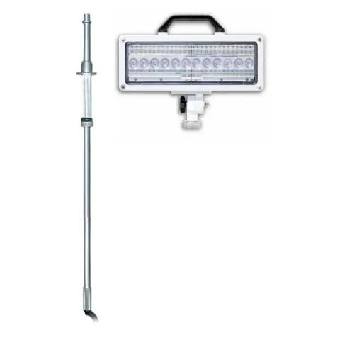 The lamphead has 84 ultra-bright white LEDs, 72 for flood lighting and 12 to provide a spot light beam pattern. It generates 28,000 lumens of light. The lamphead has a unique lens that directs flood lighting onto the work area and focuses the spot light beam into the distance. The lamphead angle of elevation shall be adjustable at a pivot in the mounting arm and the position locked with a round knurled locking knob. The lamphead has a heat resistant handle. The lamphead and mounting arm are powder coated.