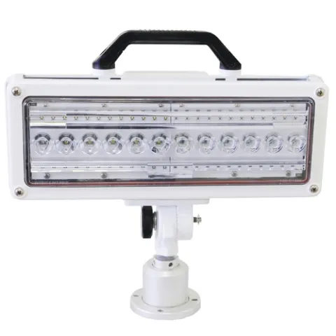 The lamphead has 84 ultra-bright white LEDs, 72 for flood lighting and 12 to provide a spot light beam pattern. It generates 28,000 lumens of light. The lamphead has a unique lens that directs flood lighting onto the work area and focuses the spot light beam into the distance. The lamphead angle of elevation shall be adjustable at a pivot in the mounting arm and the position locked with a round knurled locking knob. The lamphead has a heat resistant handle. The lamphead and mounting arm are powder coated.