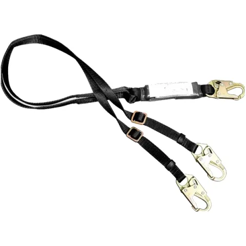This adjustable Dual-Leg web Lanyard with pack style shock absorber limits fall arrest forces to 900 lbs. when tested to OSHA & ANSI standards.