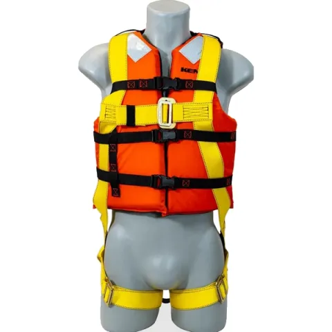 Full Body Harness, pass-thru buckle legs, sub-pelvic strap, single back dorsal D-ring, integrated USCG Type III PFD, 6 point adjustability.