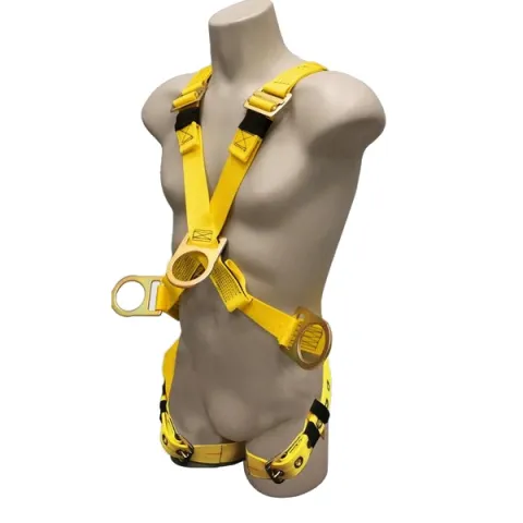 Full body harness, cross over style, single back dorsal d-ring, chest d-ring, hip D-rings, tongue buckle legs, 4 point adjustment.