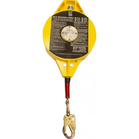 100 FT Self Retracting Lifeline, Stainless Steel Wire Rope, Cast Aluminum Housing, and load indicating snap hook. Carabiner not included.