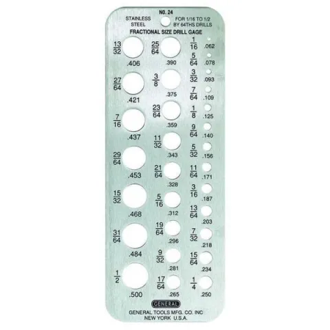 24 Hobby Drill Gauge offers a quick and accurate way to check drill and rod sizes. This fractional drill gauge is a useful guide for identifying drill bit sizes and has 29 measuring holes for determining twist drill sizes from 1/16" to 1/2" in 1/64" increments. The tool shows drill sizes in both inches and decimal equivalents. Etched graduations are filled in black to give high contrast and will not wear off this drill gauge. The gauge measures 2-3/8 inch x 6-3/4 inch (60 x 172mm) overall and is made from stainless steel to prevent rust.