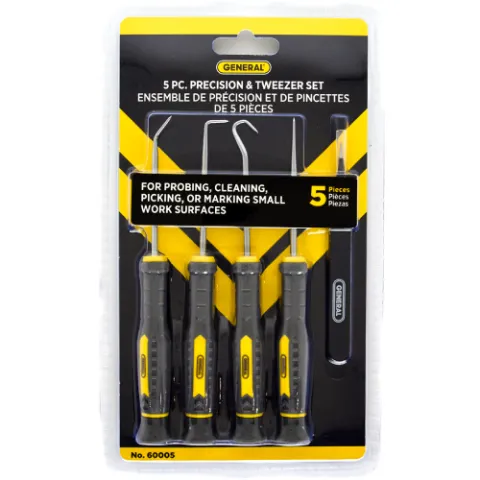 The General Tools 5 Piece Precision & Tweezer Set is perfect for any toolbox or workshop. This kit features non-slip handles for enhanced grip and comfort, and they have rotating heads for control, stability, and maximum adaptability in hard-to-reach areas. Crafted from durable, high-quality materials, this set includes 4 different-sized probes and 1 tweezer, making it ideal for precision work such as electronics, jewelry-making, or other delicate tasks.