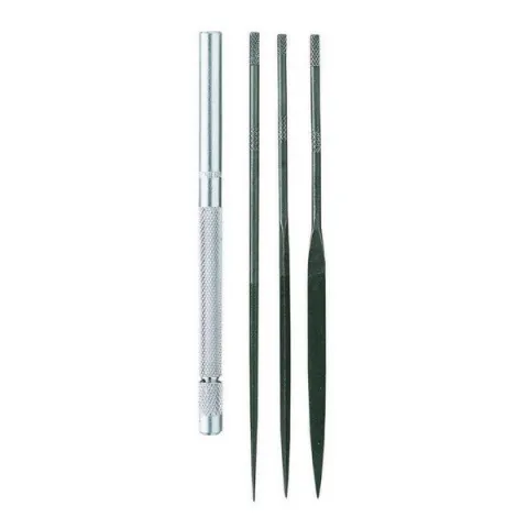 The #S477 Four-piece Tool Steel Needle File Set with Handle is ideal for craftspersons and hobbyists.