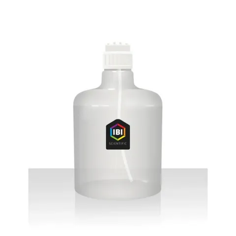 The 10 liter culture media bottle is constructed of polycarbonate and can be autoclaved and re-used in the flow cell system. Bottle comes with cap containing fixtures and tubing necessary for connecting to an IBI flow cell system.