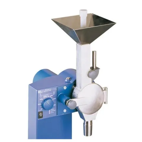 For crushing fibrous substances such as paper and vegetation, but also for plastics and material with a low volume weight. Before being discharged, the ground material passes through a sieve. This sieve is interchangeable and available in different hole sizes (not incl. with delivery). The ground material can then be collected using an NS 29 standard ground vessel.