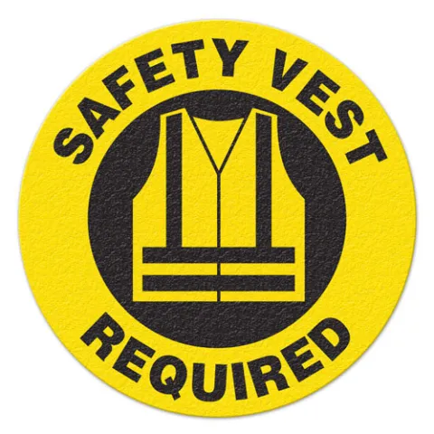 Safety Vest Required 17" diameter high visibility graphic floor signs provide a constant reminder to your employees about important Workplace Hazard, Safety Requirement and General Notice information details. Constructed from a high quality adhesive vinyl, we laminate a thick textured vinyl to these signs for added durability as well as slip resistance. The sub-surface printed images provide extended durability and will stand up to heavy pedestrian traffic. The aggressive adhesive will adhere to most smooth, clean and dry floors.