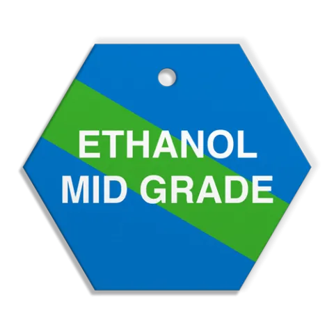 CPPI "Ethanol Mid Grade" plastic fuel type identification plastic tags are commonly displayed on fuel tank trailers, and vehicles to help both identify products and prevent mixing. Easily identify different categories of petroleum such as aviation products, middle distillates, heavy fuel oils, lubricating oils and solvents by utilizing recognizable shapes. Made from a thick 0.055" high-density polyethylene plastic 2.56" diameter hexagon (6.5cm) tag with a 0.3" (7.5mm) drilled hole. Printed on both sides and sold 250 per package.