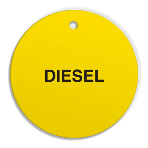 CPPI "Diesel" plastic fuel type identification plastic tags are commonly displayed on fuel tank trailers, and vehicles to help both identify products and prevent mixing. Easily identify different categories of petroleum such as aviation products, middle distillates, heavy fuel oils, lubricating oils and solvents by utilizing recognizable shapes. Made from a thick 0.055" high-density polyethylene plastic 2.56" diameter circle (6.5cm) tag with a 0.3" (7.5mm) drilled hole. Printed on both sides and sold 250 per package.