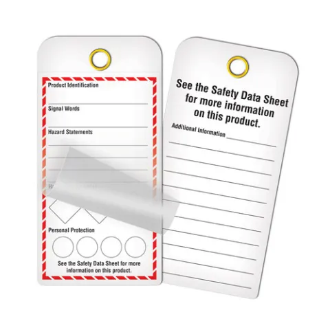 Use our "Make Your Own" GHS style workplace tags to clearly identify hazards to your employees. Our GHS tags offer a simple template design to build your tag on. The tags are made from a waterproof synthetic stock that can easily be printed on. Tags are available in two options, our standard All-Weather Duraply® base stock that can be easily written on as well as the more durable option with a clear lamination flap that is applied over your copy for added weather and chemical resistance in harsh conditions.