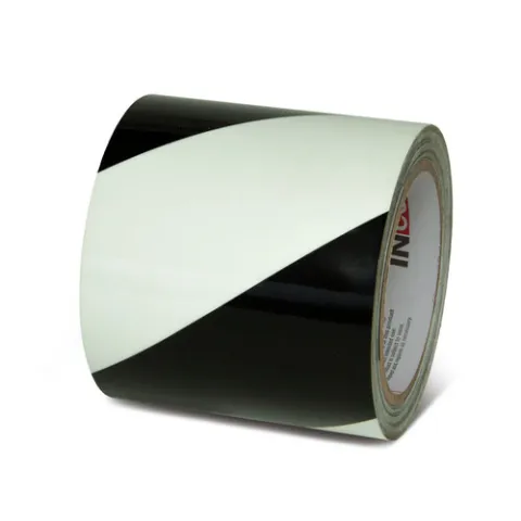 Our black hazard stripe Photoluminescent Glow-in-the-Dark Tapes will "GLOW" 6+ hours. This product comes with an aggressive permanent pressure sensitive adhesive that will adhere to most any clean, dry surface.