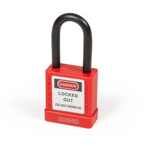 Red aluminum lockout/tagout padlock with rubber-coated shackle for harsh environments and high-visibility safety.This durable LOTO padlock features a corrosion-resistant aluminum alloy body with a bright red plastic outer shell for increased visibility in industrial settings. The Ø0.24 inch (6mm) diameter, 1.50 inch (38mm) high hardened steel shackle is coated with a black silicone sleeve to protect against rust, moisture, and chemical exposure. Built for demanding lockout situations, the padlock includes an auto-pop shackle and key-retaining feature to prevent accidental key removal when unlocked. Ideal for environments requiring rugged, weather-resistant lockout solutions with strong visual hazard indicators.