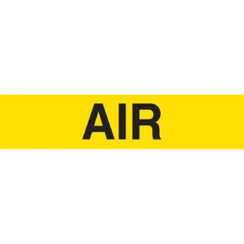 Durable, self-adhesive VynMark AIR Yellow / Black Printed pipe markers for fast, compliant identification in industrial and commercial facilities.PM-Series Printed Self-Adhesive VynMark Pipe Identification Markers are manufactured from outdoor-grade flexible vinyl and finished with a clear protective coating that resists fading, abrasion, grease, dust, and moisture. Each marker features a high-tack acrylic adhesive with an easy peel-off liner, ensuring smooth, reliable installation on clean, smooth pipe surfaces. These markers meet ANSI / ASME and IIAR pipe identification requirements. Use with INCOM's Pipe Marker Adhesive Directional Flow Arrows on a roll, available separately.