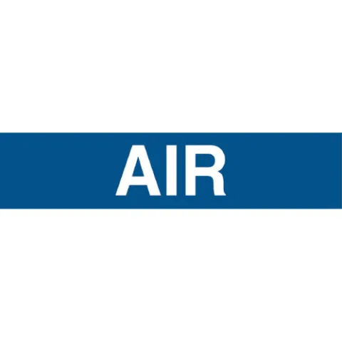 Durable, self-adhesive VynMark AIR Blue / White Printed pipe markers for fast, compliant identification in industrial and commercial facilities.PM-Series Printed Self-Adhesive VynMark Pipe Identification Markers are manufactured from outdoor-grade flexible vinyl and finished with a clear protective coating that resists fading, abrasion, grease, dust, and moisture. Each marker features a high-tack acrylic adhesive with an easy peel-off liner, ensuring smooth, reliable installation on clean, smooth pipe surfaces. These markers meet ANSI / ASME and IIAR pipe identification requirements. Use with INCOM's Pipe Marker Adhesive Directional Flow Arrows on a roll, available separately.