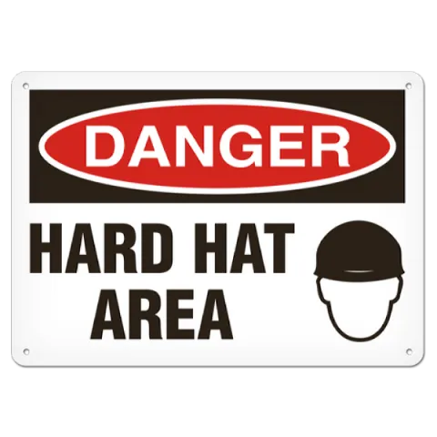 Improve your workplace safety with the use of OSHA style Danger - Hard Hat Area safety signs available in an assortment of materials including adhesive VynMark®, rigid HDPE plastic, aluminum and aluminum + UV lamination for extended long-term outdoor applications with several sizes to meet your specific safety identification requirements.
