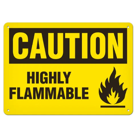 Improve your workplace safety with the use of OSHA style Caution - Highly Flammable safety signs available in an assortment of materials including adhesive, plastic and aluminum with several sizes to meet your specific safety identification requirements.