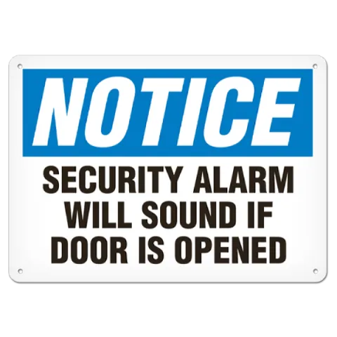 Improve your workplace safety with the use of OSHA style Notice - Security Alarm Will Sound If Door Is Opened safety signs available in an assortment of materials including adhesive, plastic and aluminum with several sizes to meet your specific safety identification requirements.