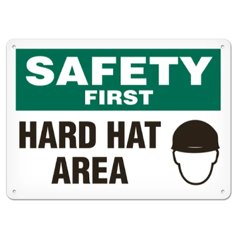 Improve your workplace safety with the use of OSHA style Safety First - Hard Hats Required Area safety signs available in an assortment of materials including adhesive, plastic and aluminum with several sizes to meet your specific safety identification requirements. Consult local regulations for specific guidelines.