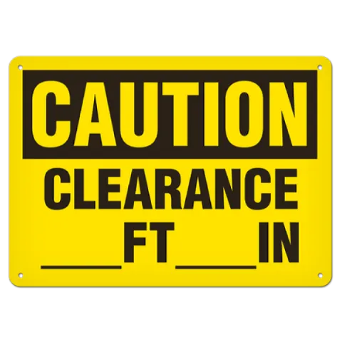 Improve your workplace safety with the use of OSHA style Caution - Clearance __ FT __ IN safety signs available in an assortment of materials including adhesive, plastic and aluminum with several sizes to meet your specific safety identification requirements.