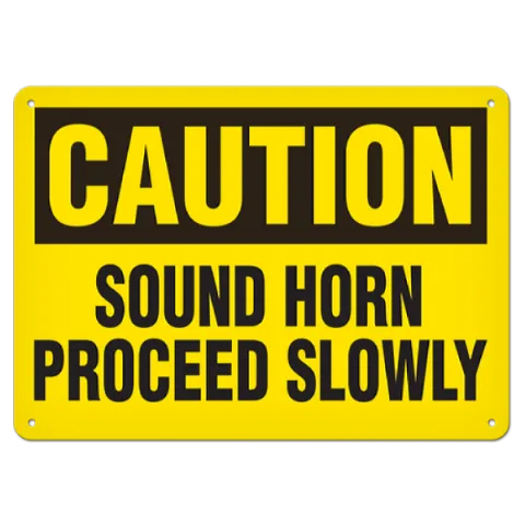 Improve your workplace safety with the use of OSHA style Caution - Sound Horn Proceed Slowly signs available in an assortment of materials including adhesive, plastic and aluminum with several sizes to meet your specific safety identification requirements.