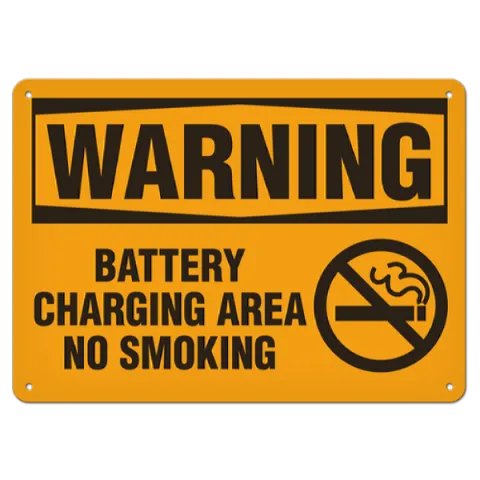 Improve your workplace safety with the use of OSHA style Warning - Battery Charging Area No Smoking safety signs available in an assortment of materials including adhesive VynMark®, rigid HDPE plastic, aluminum and aluminum + UV lamination for extended long-term outdoor applications with several sizes to meet your specific safety identification requirements.