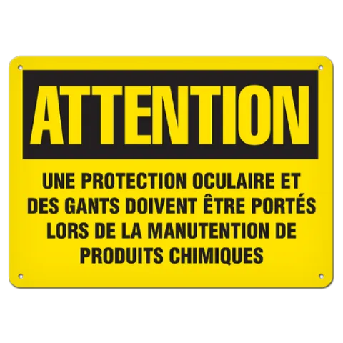 Improve your workplace safety with the use of OSHA style ATTENTION - Une protection oculaire et des gants safety signs available in an assortment of materials including adhesive, plastic and aluminum with several sizes to meet your specific safety identification requirements.