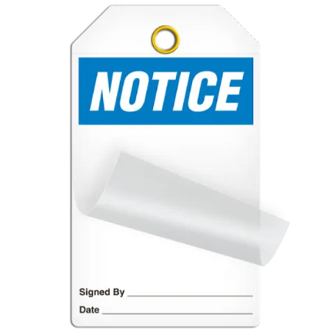 Our stock self laminating tags offer an easy way to protect the information on your tags. Designed with a thick 2 mil clear protective laminating flap, these tags are a highly durable option for use in your facility. Simply write in the information, peel off the backing from the lamination flap and seal the tag. Once sealed, the information on your tag will be protected from dirt abrasion or chemical splashes. Tags are made from our All-Weather Duraply® synthetic base stock with a clear poly over-lamination flap. Also a great way to prevent further changes to the tag once it is put into use. Tags are made from a durable 10 mil synthetic stock and measure 3-3/8" x 5-3/4". Sold in packages of 24 with 3/8" metal eyelet.