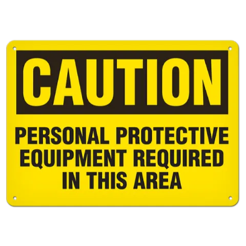 Improve your workplace safety with the use of OSHA style Caution - Personal Protective Equipment Required In This Area safety signs available in an assortment of materials including adhesive, plastic and aluminum with several sizes to meet your specific safety identification requirements.