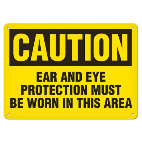 Improve your workplace safety with the use of OSHA style Caution - Ear And Eye Protection Must Be Worn In This Area signs available in an assortment of materials including adhesive, plastic and aluminum with several sizes to meet your specific safety identification requirements.