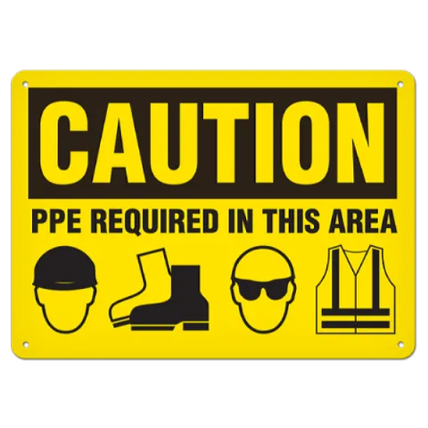 Improve your workplace safety with the use of OSHA style Caution - PPE Required In This Area signs available in an assortment of materials including adhesive, plastic and aluminum with several sizes to meet your specific safety identification requirements.