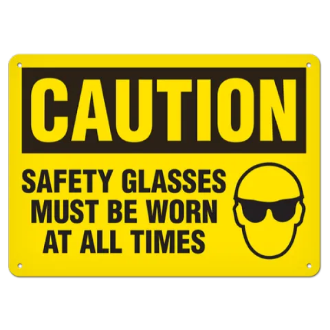 Improve your workplace safety with the use of OSHA style Caution - Safety Glasses Must Be Worn At All Times signs available in an assortment of materials including adhesive, plastic and aluminum with several sizes to meet your specific safety identification requirements.