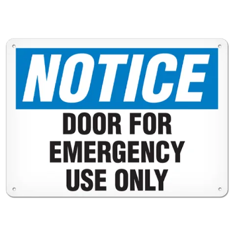Improve your workplace safety with the use of OSHA style Notice - Door For Emergency Use Only safety signs available in an assortment of materials including adhesive, plastic and aluminum with several sizes to meet your specific safety identification requirements.