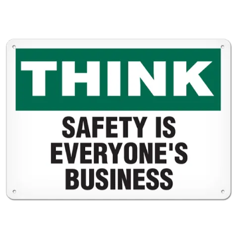 Improve your workplace safety with the use of OSHA style Think First - Safety Is Everyone's Business safety signs available in an assortment of materials including adhesive, plastic and aluminum with several sizes to meet your specific safety identification requirements. Consult local regulations for specific guidelines.