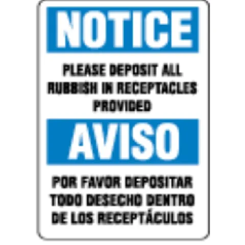 • BILINGUAL Notice - Please Deposit All Rubbish In Receptacles Provided / Por Favor Depositar Todo Desecho Dentro De Los Receptáculos