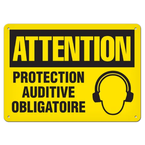 Improve your workplace safety with the use of OSHA style ATTENTION - Protection auditive obligatoire safety signs available in an assortment of materials including adhesive, plastic and aluminum with several sizes to meet your specific safety identification requirements.