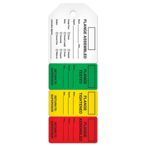 Flange Management Inspection Tags (Torque Tags) 4-Stage valve inspection tags, provide an easy-to-use, clear flange status for your workers. Enhanced flange management procedures help reduce the risk of leaks and other technical issues. Flange Tags are intended for use in pipeline construction, oil and gas operations and energy distribution and production operations. Tags are made from a durable 10 mil (0.0010") Duraply™ All-Weather synthetic stock that is water resistant, easily written on and can be used in outdoor applications. Flange tags are 2.75" x 7.9" with perforation between each section to allow for simple separation of the 4-parts during use. Sold in packages of 25 with 0.375" dia mounting hole.