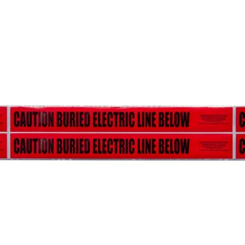 Buried Electric Line Below PrimeGuard® detectable underground tape consist of a 5.0 mil thickness foil and poly laminated structure and are designed to detect, locate, identify, and protect buried utility lines for gas, telecommunication, and electrical markets. The PrimeGuard® warning legends are printed black text on red APWA color-coded background on an aluminum foil core with lamination on both sides for durability. Always consult regulatory guidelines for the proper use of underground warning marks.