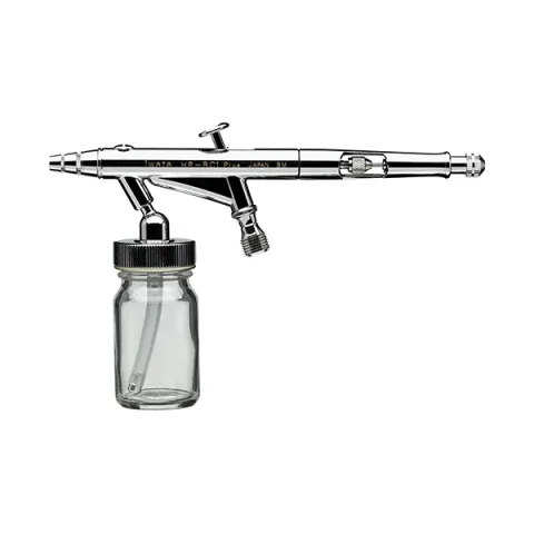 Iwata High Performance HP-BC1 Plus has a 0.68 oz / 20 ml glass jar that is ideal when using a higher volume of spray medium. One of the benefits to siphon feed is the ability to use multiple bottles that can hold larger volumes of spray material, as compared to gravity-feed airbrushes. Quick color changes can be made using multiple bottles and pre-filling them with your favorite colors. (extra bottles come in a variety of sizes and types and are sold separately)