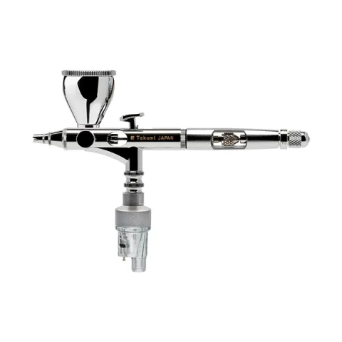 Iwata Custom Micron Takumi Side Feed Airbrush, first and foremost, has all of the spray attributes of Iwata Custom Micron airbrushes. In addition this side feed model also includes a redesigned, compact body style for improved control and balance. This, combined with a new gravity assisted side feed cup improves paint flow, making Takumi remarkably responsive. The two-piece 0.24 oz / 7 ml cup design disassembles for easy cleaning and siphon cut lid helps reduce paint build-up.