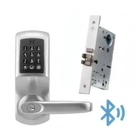 Smart lockset with BLE and WiFi connectivity, featuring a mortise lock body for commercial door applications requiring advanced access control.