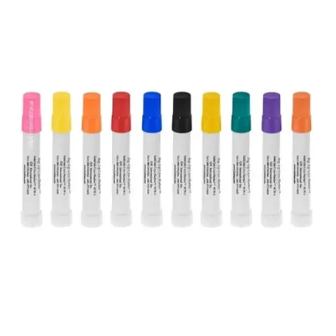 Water-resistant big tip cryo marker. Provided in an assortment of colors (e.g. blue, red, green, orange and yellow) these permanent ink marker can withstand a range of temperatures (-196°C/-321°F to 200°C/392°F). Easy to use, the solid ink markers work on most surfaces, dry in 5-7 minutes and will not fade.