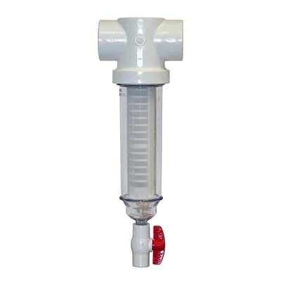 - Sediment is visible through clear cover and quickly removed by opening ball valve at bottom of filter cover