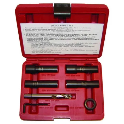 Don't torch frozen/damaged lug nuts off - just drill out the lug nut threads and the wheel stud ONLY in 11 minutes or less. Easily replace damaged lug nut and wheel stud. Does not damage rim. Improved 16mm step up cobalt drill bit. Comes with a locking collar clamp for safety. Includes 4 drill guides. Packaged in a custom blow molded carrying case.