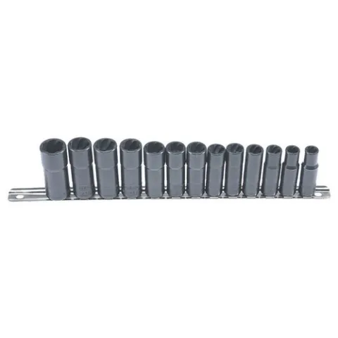 This kit easily removes damaged nuts, studs, pipe nipples and bolts. Ideal for times when a deep well socket is needed. Comes mounted on a 3/8" rail, individually packaged. With LT-4630 - 13 Piece Metal Rack.