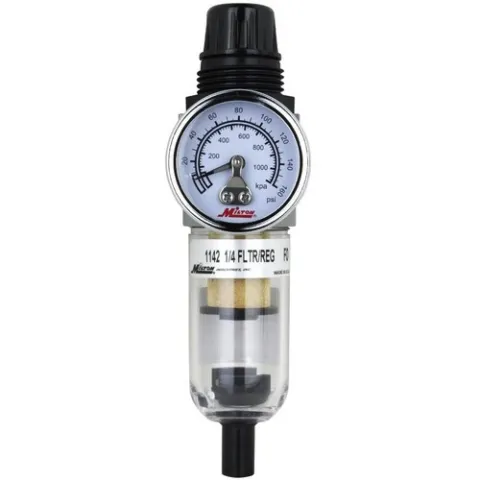 The Milton 1/4" NPT Polycarbonate Mini Piggyback FR Duo Filter-Reducer is designed for space efficiency without compromising functionality. This mini duo unit is preassembled with a 0-160 PSI gauge for convenient pressure monitoring (#1189 by Milton®). The polycarbonate bowl ensures durability and allows for easy visibility of contents.