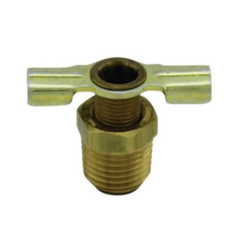 This 1/4" NPT drain cock is a replacement part for old or damaged drain cocks on compressor tanks. Turn handle to drain water, close drain cock when water is drained. Always release air from tanks before replacing drain cock. Drain cock body is brass, handle is steel.